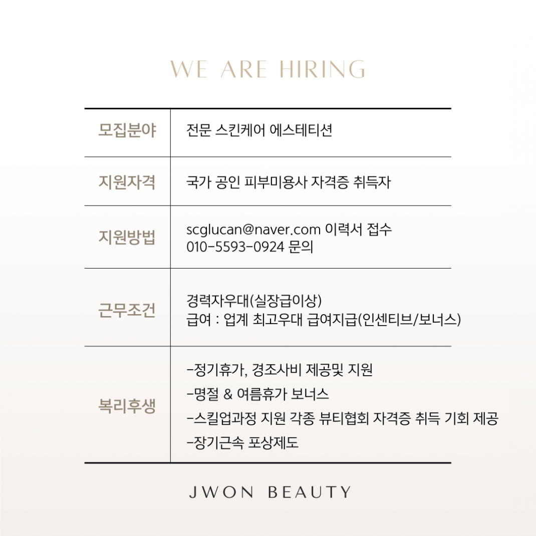 제이원 뷰티에서 에스테틱 직원을 모집합니다.